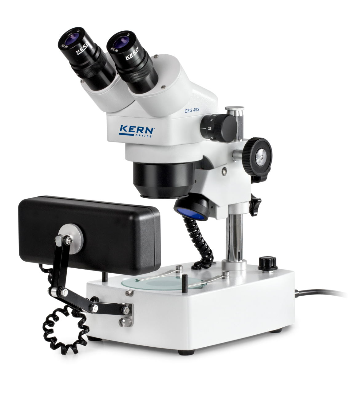 - The KERN OZG 493 is fitted with a pole stand which has both integrated bright halogen light units with incident and transmitted illumination, as well as additional front lighting
