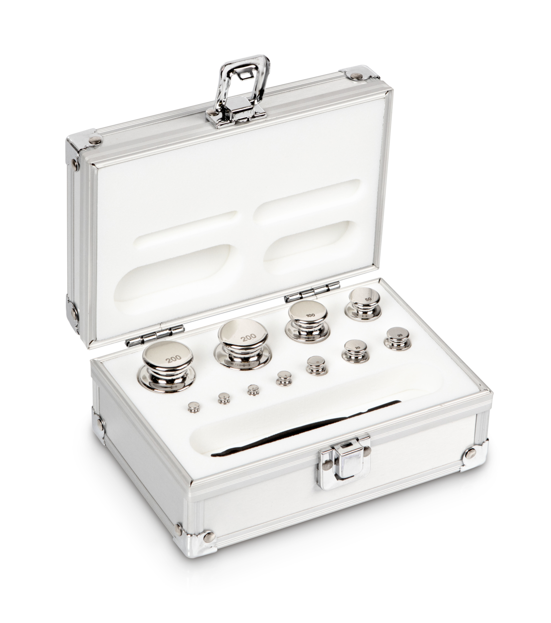 Set of weights 304-046, OIML Class E1, Nominal value 1 g – 200 g, Knob, Stainless steel polished, in aluminium case