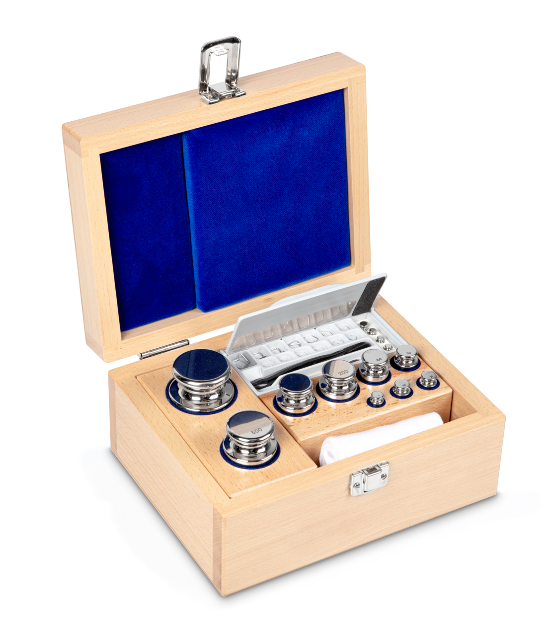 Set of weights 304-06, OIML Class E1, Nominal value 1 g – 1 kg, Knob, Stainless steel polished, in wooden case