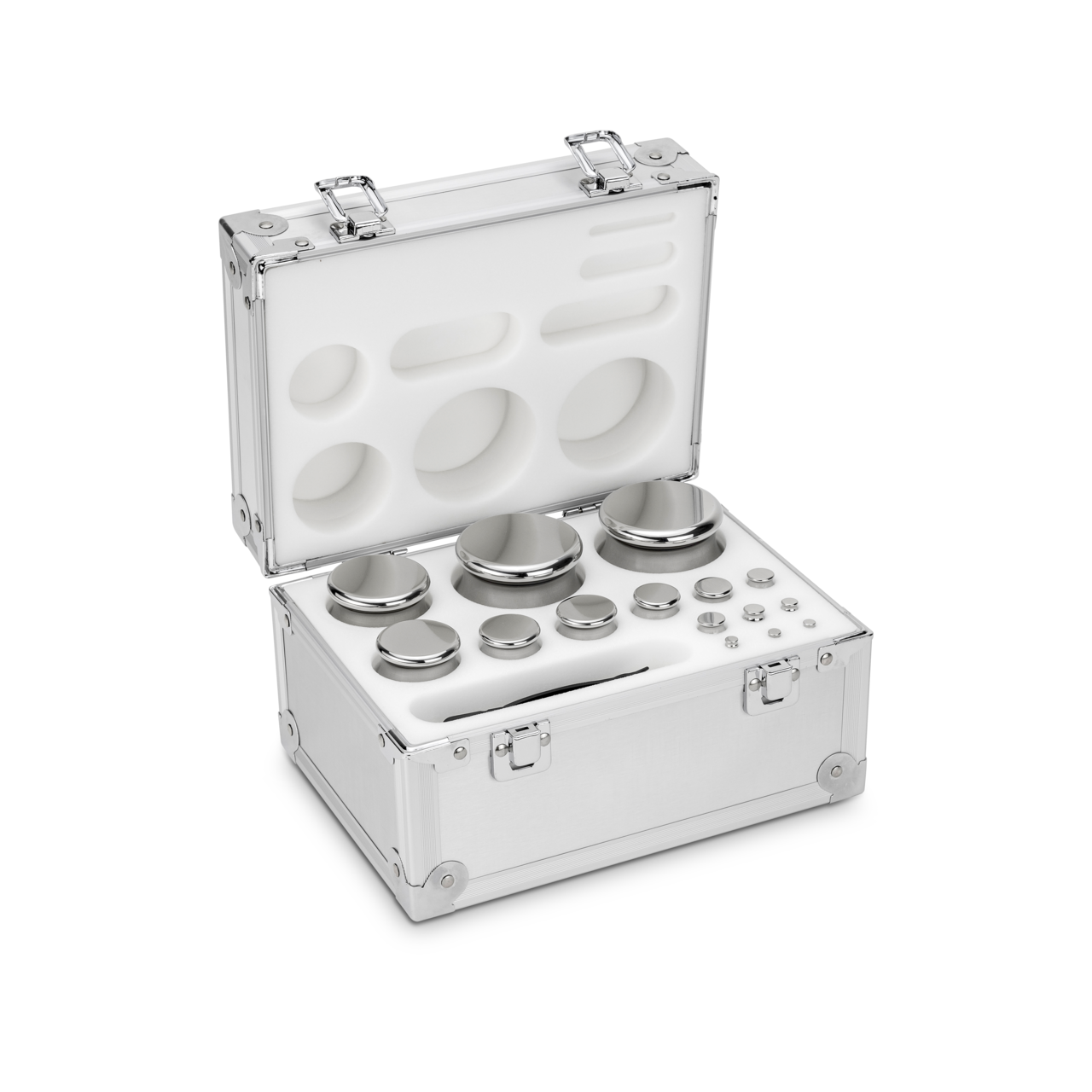 Set of weights 312-076, OIML Class E2, Nominal value 1 g – 2 kg, Compact form, stainless steel polished (OIML), in aluminium case