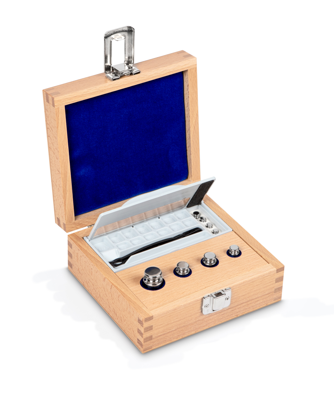 Set of weights 314-02, OIML Class E2, Nominal value 1 g – 50 g, Knob, stainless steel polished (OIML), in wooden case